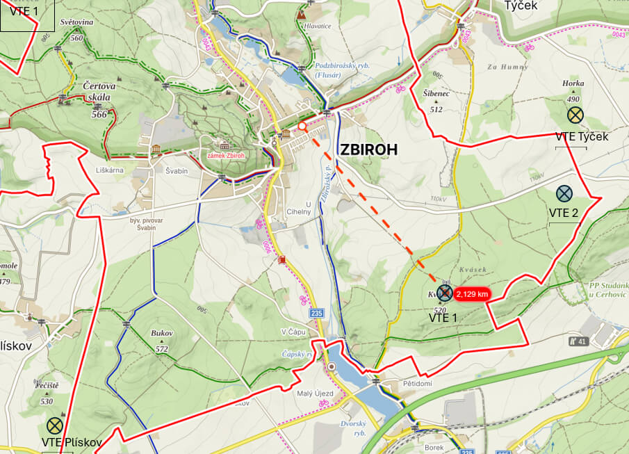 ) jsou na mapě vyznačeny dvě VTE, které připravujeme též v sousedních obcích Plískov a Týček. Po diskusi se starosty obcí Mikroregionu Zbirožsko bychom rádi nabídku komunitní energetiky z VTE rozšířili i na obyvatele všech obcí mikroregionu (k čemuž potřebujeme výkon 4 VTE).